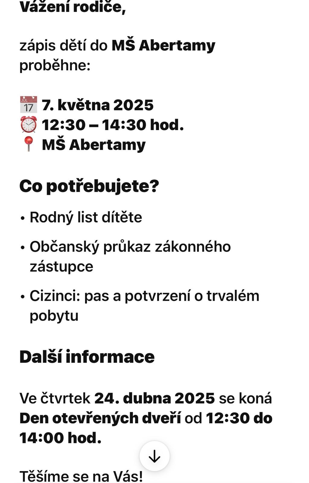 Dobrý den. Ve čtvrtek dne 2.10.2025 se koná "Drakiáda" Tuto akci pořádá město Abertamy ve spolupráci s hasičským sborem města Abertamy. Tato akce je určená hlavně pro děti a jejich rodiče, takže kdo bude chtít se svým dítkem pouštět draka, může přijít v 16:00 hod.rovnou na "Větrov",nebo přijde ke školce do 15:45 hod.,odkud půjdeme na Větrov společně Draky do školky nenoste, donesete si je, až půjdete odpoledne na akci ! Kdo se nebude akce účastnit, vyzvedne si dítě mezi 14:30 - 15:45 hod.! Město a hasičský sbor na tuto akci zajistí zdarma buřtíky i čaj